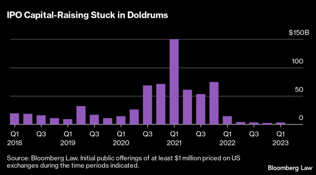 以下のグラフを見ていただくと、新型コロナ禍で積極的な金融緩和が行われていた2020年〜2021年にかけては、IPOが盛んに行われていたものの、利上げが始まった2022年以降はIPO市場が停止してしまっていたことが分かります。