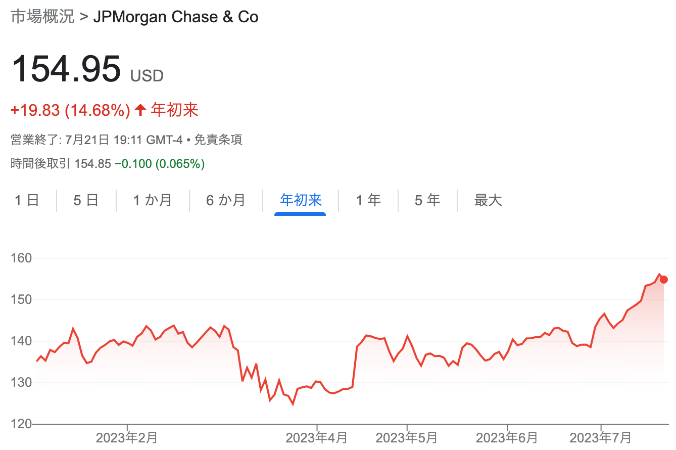 以下のように、地銀ETFと大手のJ.P.モルガンの株価推移を比べてみると、地銀ETFが3月の銀行経営破綻危機よりも前の株価に遠く及ばないのに対して、J.P.モルガンは最高値を更新していることがわかります。