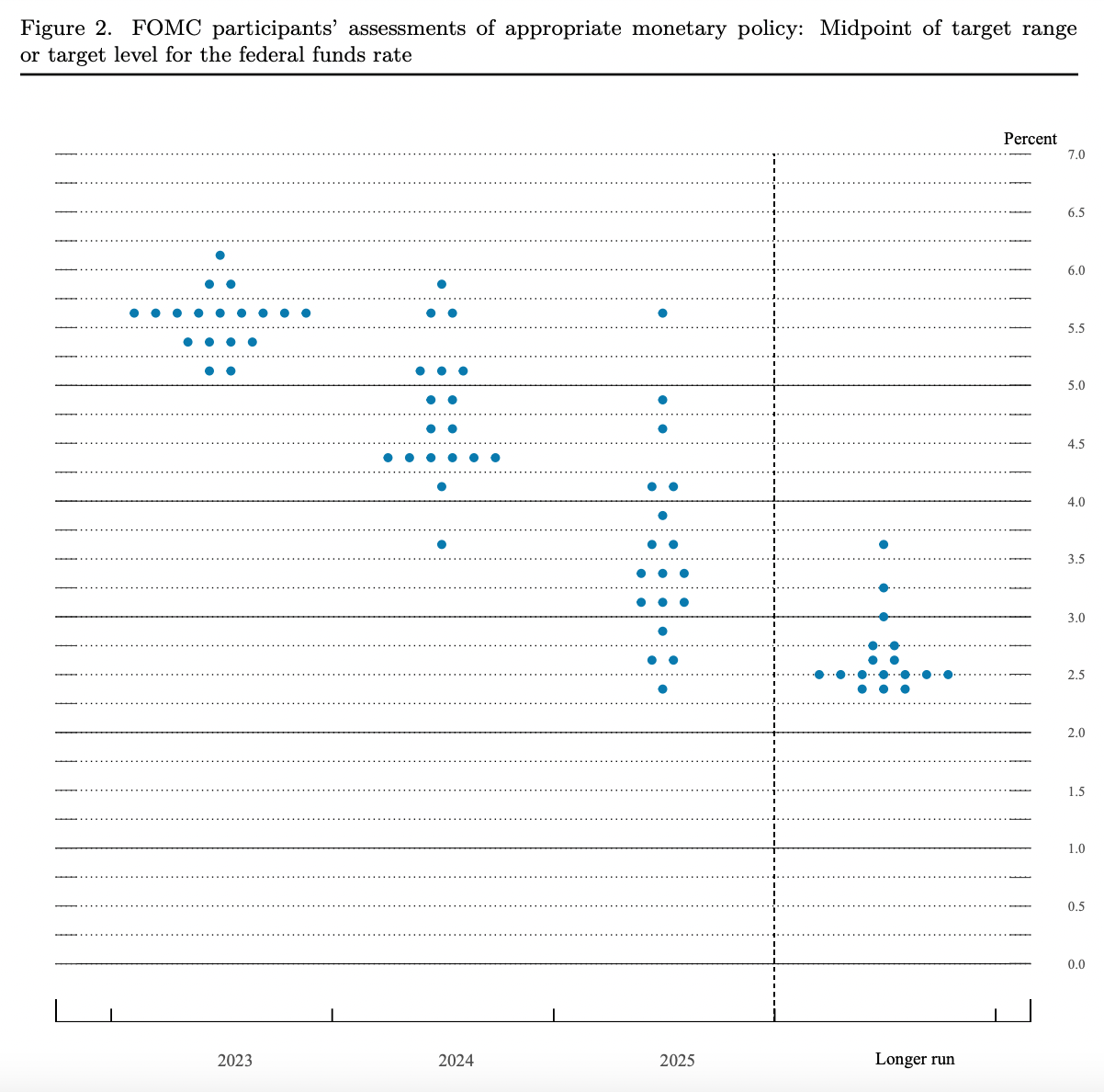 グラフをみると、2023年末には5.50%〜5.75%の政策金利を予想するメンバーが最多であることが分かります。これは今の5.00%〜5.25%から、あと2回の利上げがあることを示唆しています。