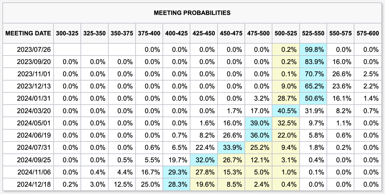 一方で、市場は5.25%〜5.50%の予想が2024年1月まで最多なので、あと1回の利上げを予想しています。