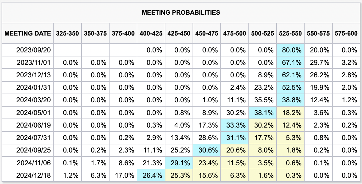 7月27日に行われたFOMCでは、0.25%の利上げが行われて、FF金利は5.25%〜5.50%となりました。市場参加者はこれで利上げは終わりだと予想しています。