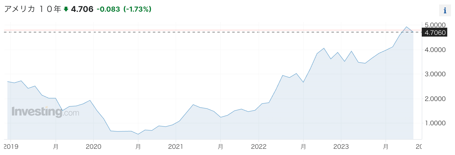 長期金利を確認すると、10月には一時的に5%に達する場面もあったが、現在は4.7%まで低下している。