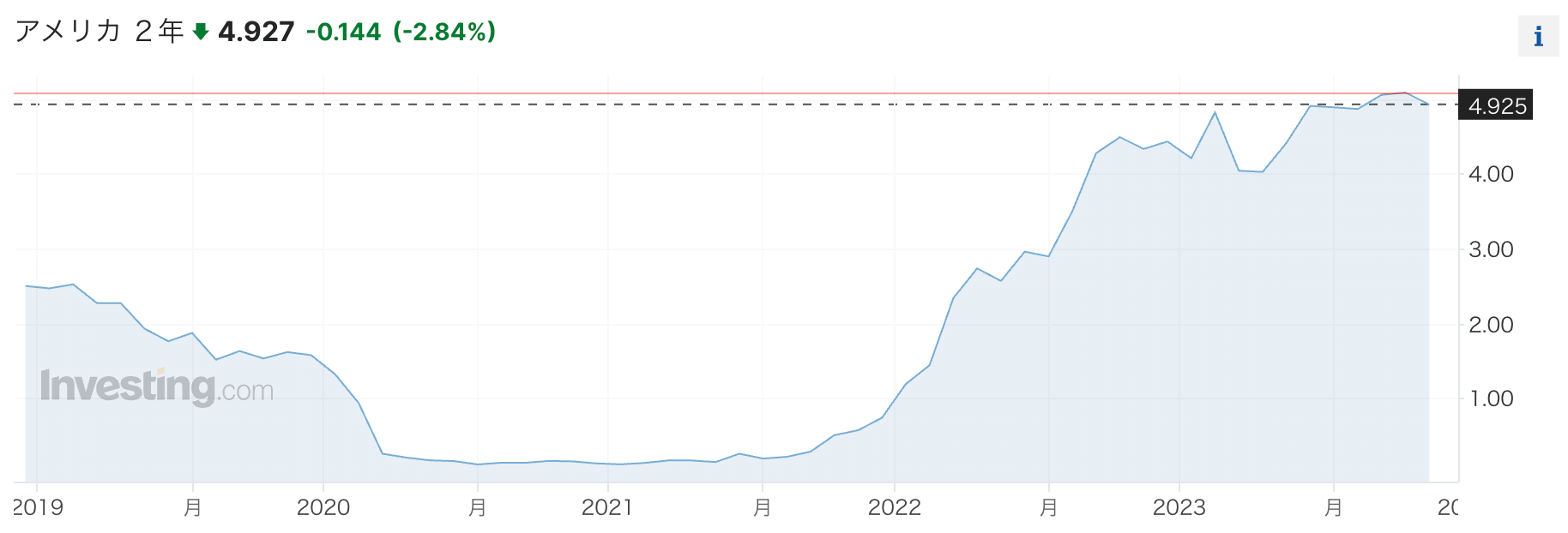 逆イールドとは、短期金利が長期金利を上回っている状態である。たとえば、直近は2年金利(4.9%)が10年金利(4.7%)を上回っているので逆イールドの状態である。