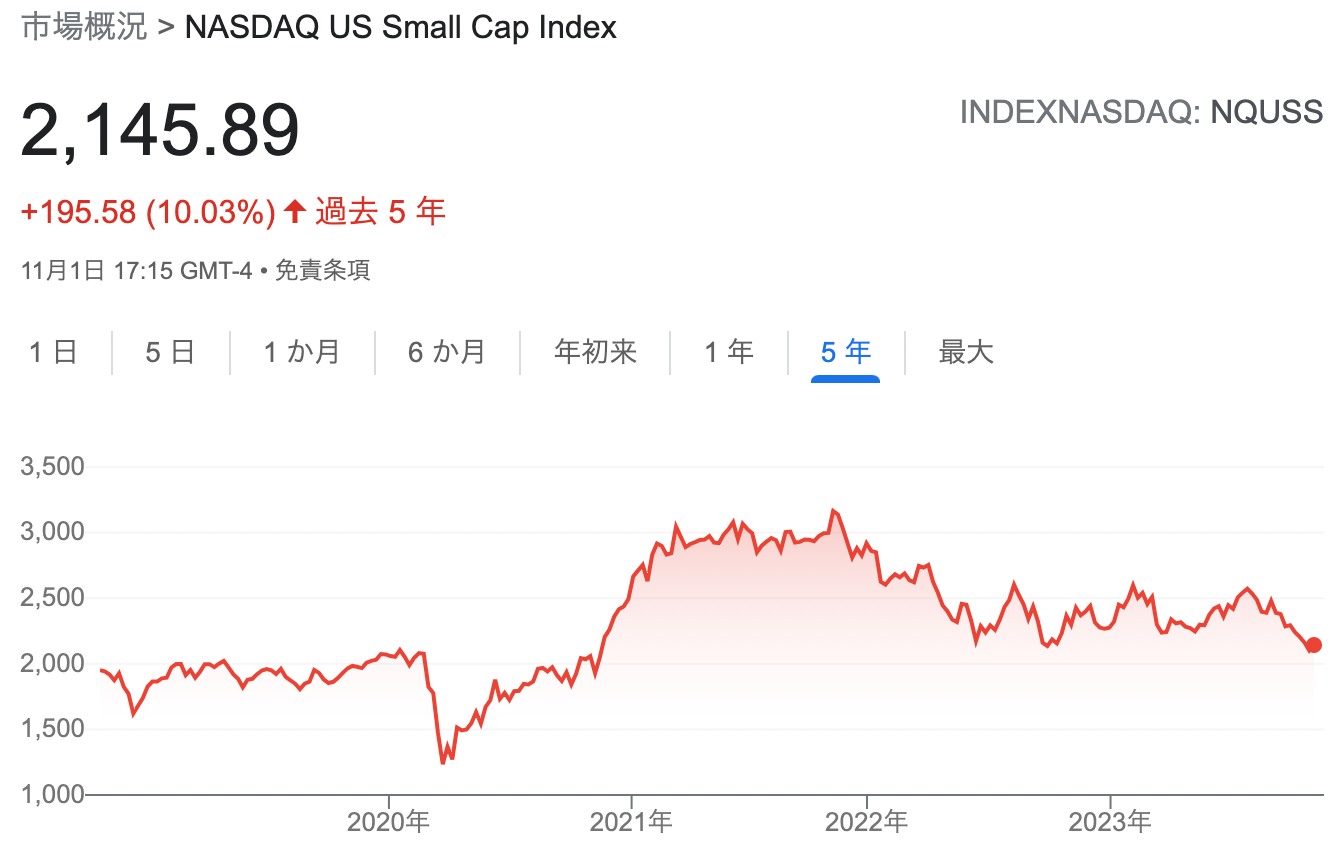 ナスダックの小型株を集めた「NASDAQ US Small Cap Index」を見ると、ピークからの下落率は33%となっている。