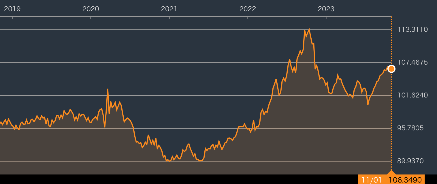 こちらも金利上昇でドル高が進む中で、ざっくりとピークから3割ほどの大幅な下落となっている。新興国の個別企業を見つけるのは難しいため、ETFで投資をするのが良いだろう。