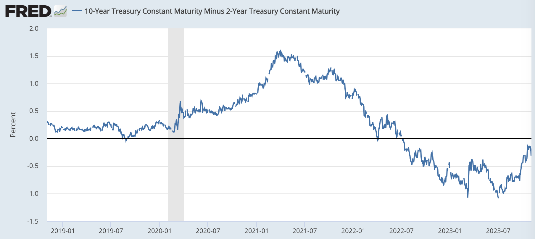 以下のグラフは、10年金利から2年金利を引いた数字の推移を表したものだが、2年金利の方が大きいため、グラフがマイナス圏に沈んでいることが分かる。