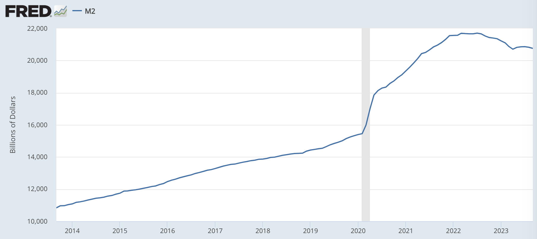 アメリカのマネーサプライは、直近QTによって減少しているが、7年前の2015年頃と比べるとほぼ2倍となっている。