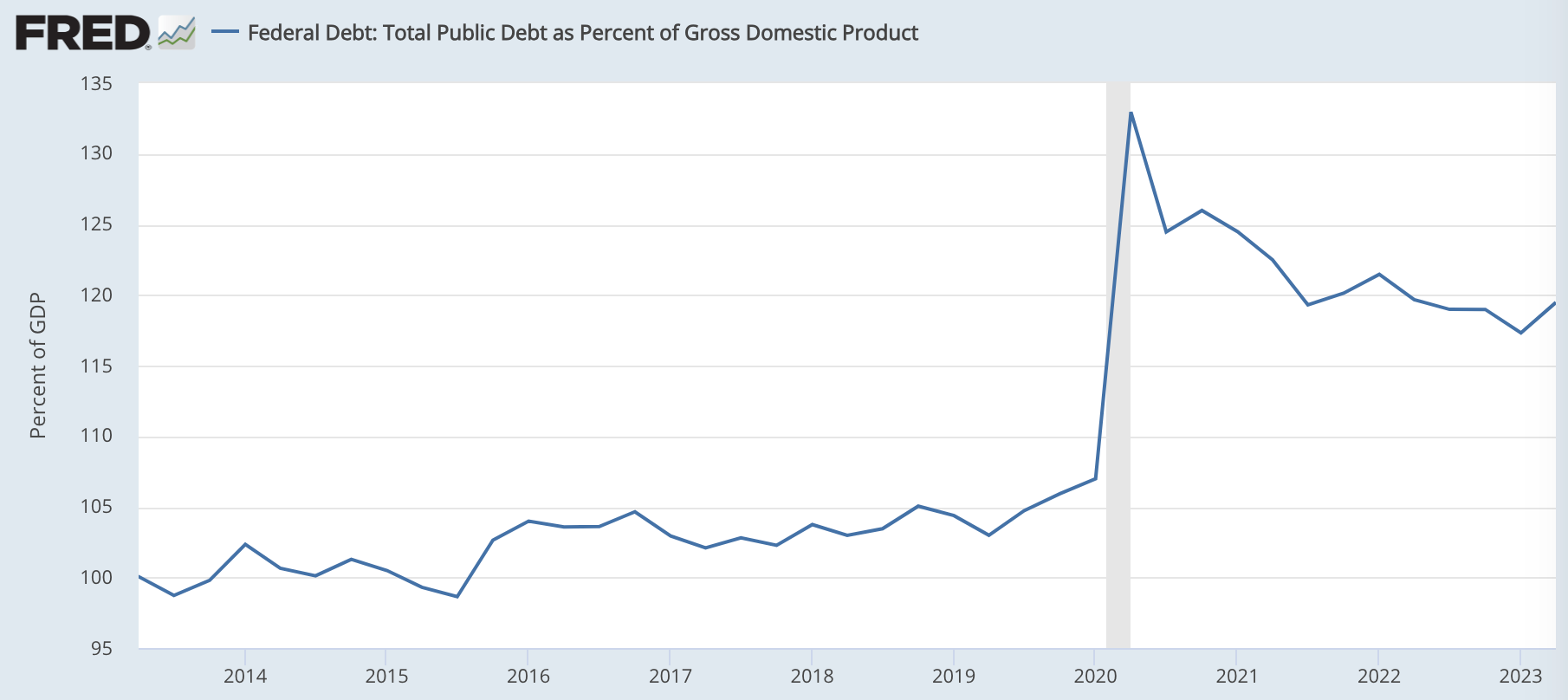 アメリカ政府はウクライナ戦争や補助金等のために財政支出を増やしている。これらは増税ではなく国債の発行によって賄われている。アメリカ政府の負債はGDPの120%ほどにまで膨らんでいるが、金利の上昇によって利払いが増えれば、今後それも新たな国債発行によって賄われるようになるだろう。