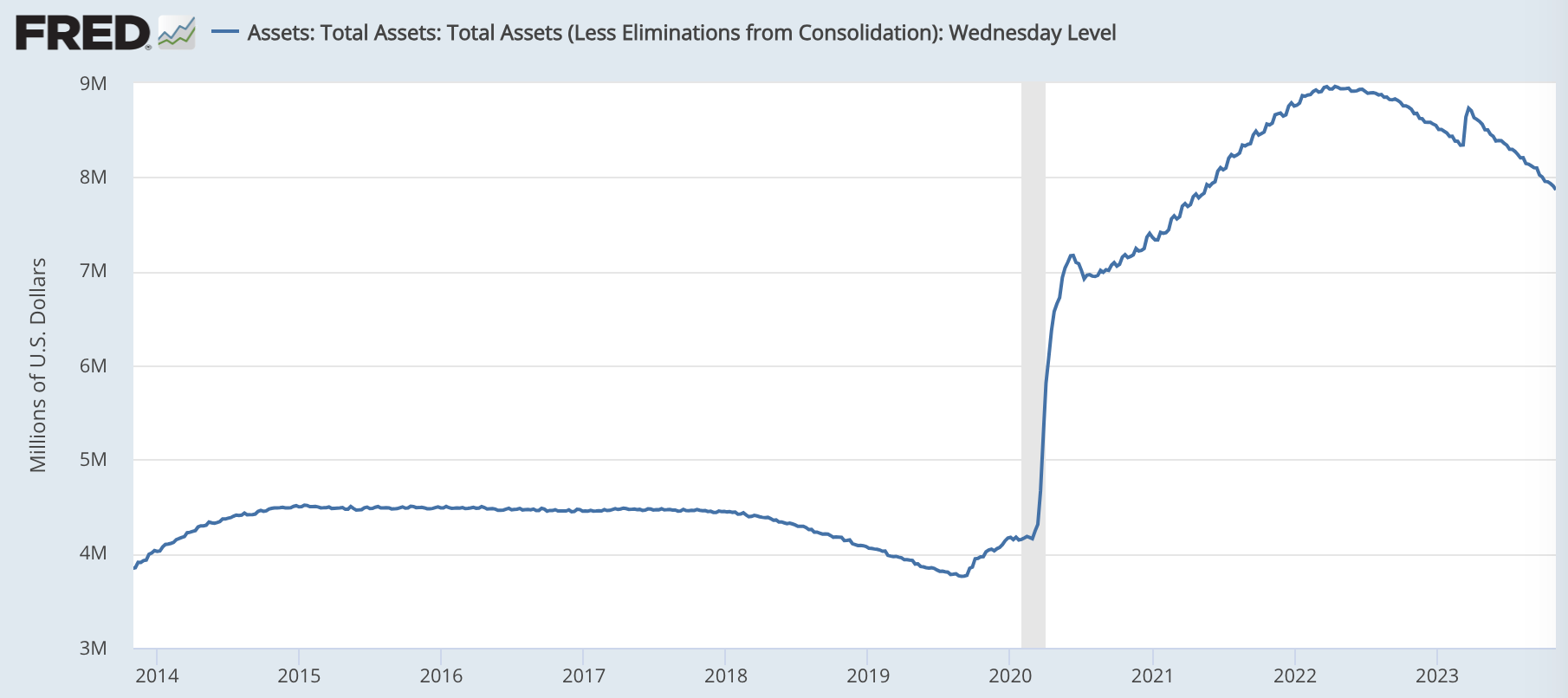 なお、JPモルガンのデータとは異なるが、FREDで確認すると個人貯蓄の総額は以下のように推移している。