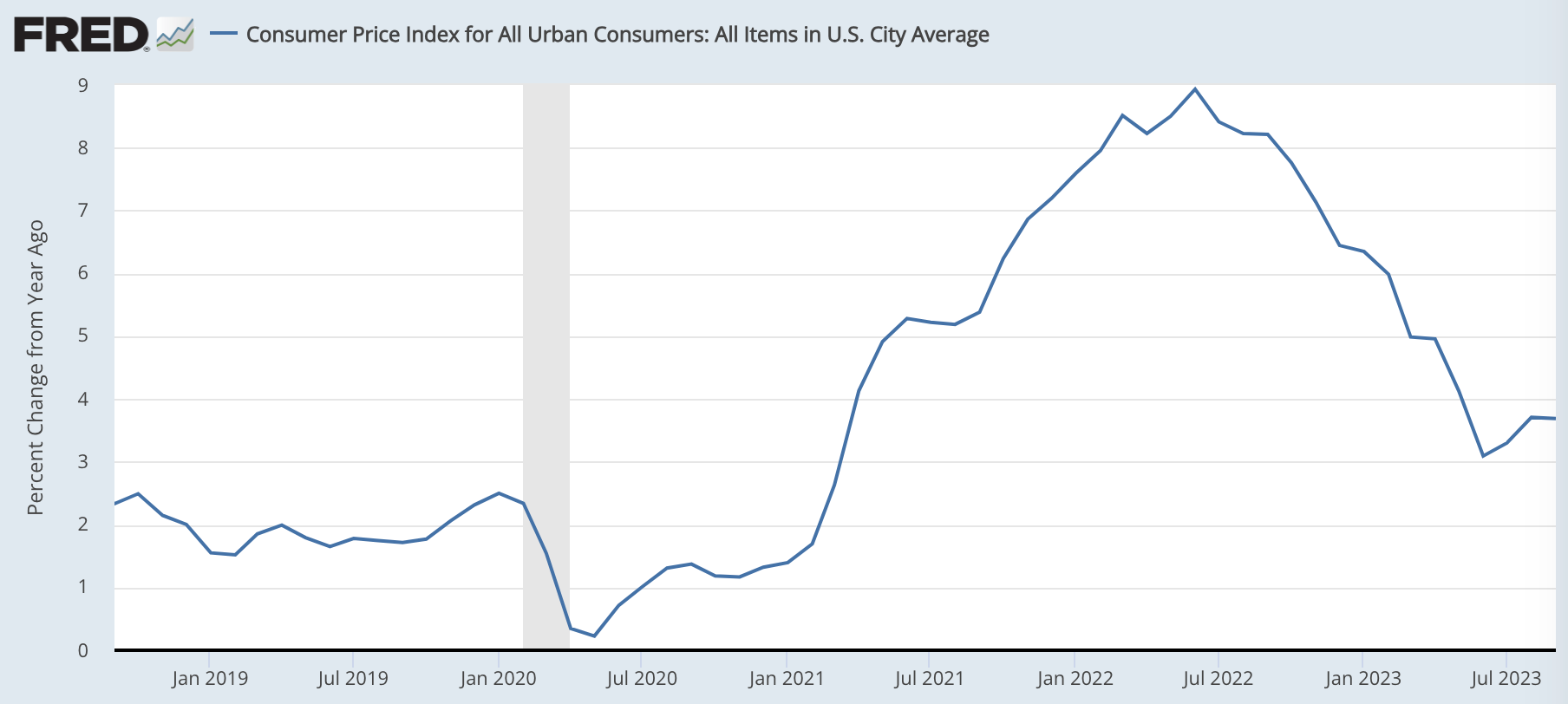 ご存知の通り、2022年の6月頃をピークとしてインフレは低下に転じてきた。直近では前年比+3%台で推移している。