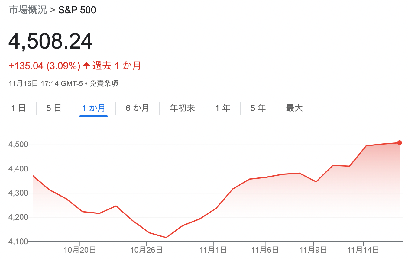 - 株式市場の反応: インフレの収束を受けて、株式市場は上昇傾向にある。S&P 500は過去1ヶ月で+3.09%上昇し、10月の底からは約10%の上昇を見せています。投資妙味のあるセクターはグロース株や暗号資産、新興国株など。