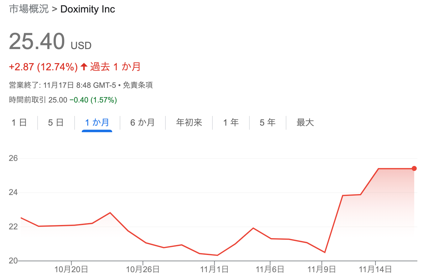 ハイグロース株の一例として20ドルあたりで紹介したドクシミティは、直近25.4ドルであり+20%以上の上昇率となっている。