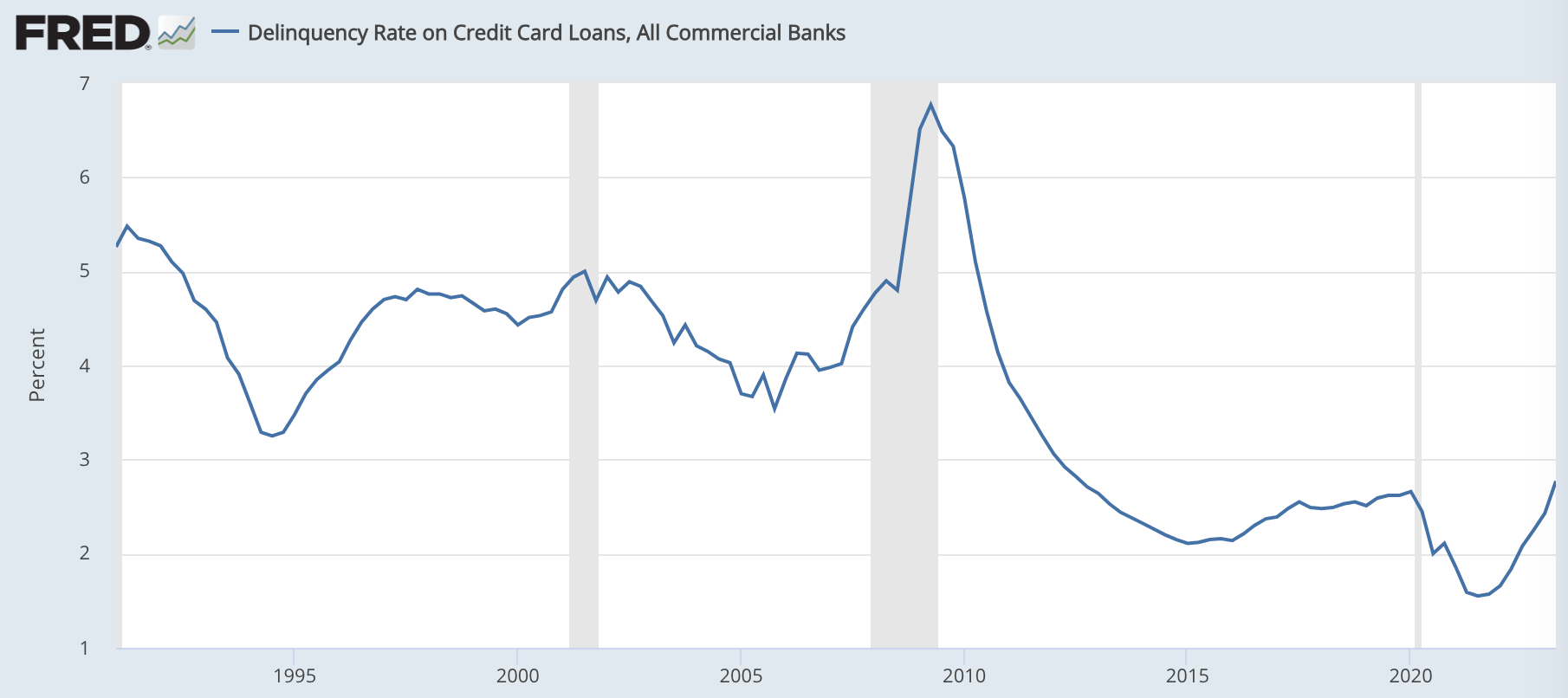 結果、クレジットカード債務の延滞率は急上昇しており、2010年代後半の1.5%〜2.5%程度の水準を超えて、3%台への突入が見えてきた状況だ。