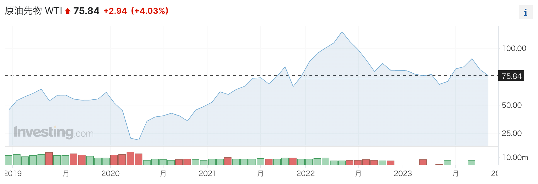 原油価格は、昨年ウクライナ戦争を受けて100ドルを超えていたが、その後は急速に低下を続けて、70ドル台で推移している。