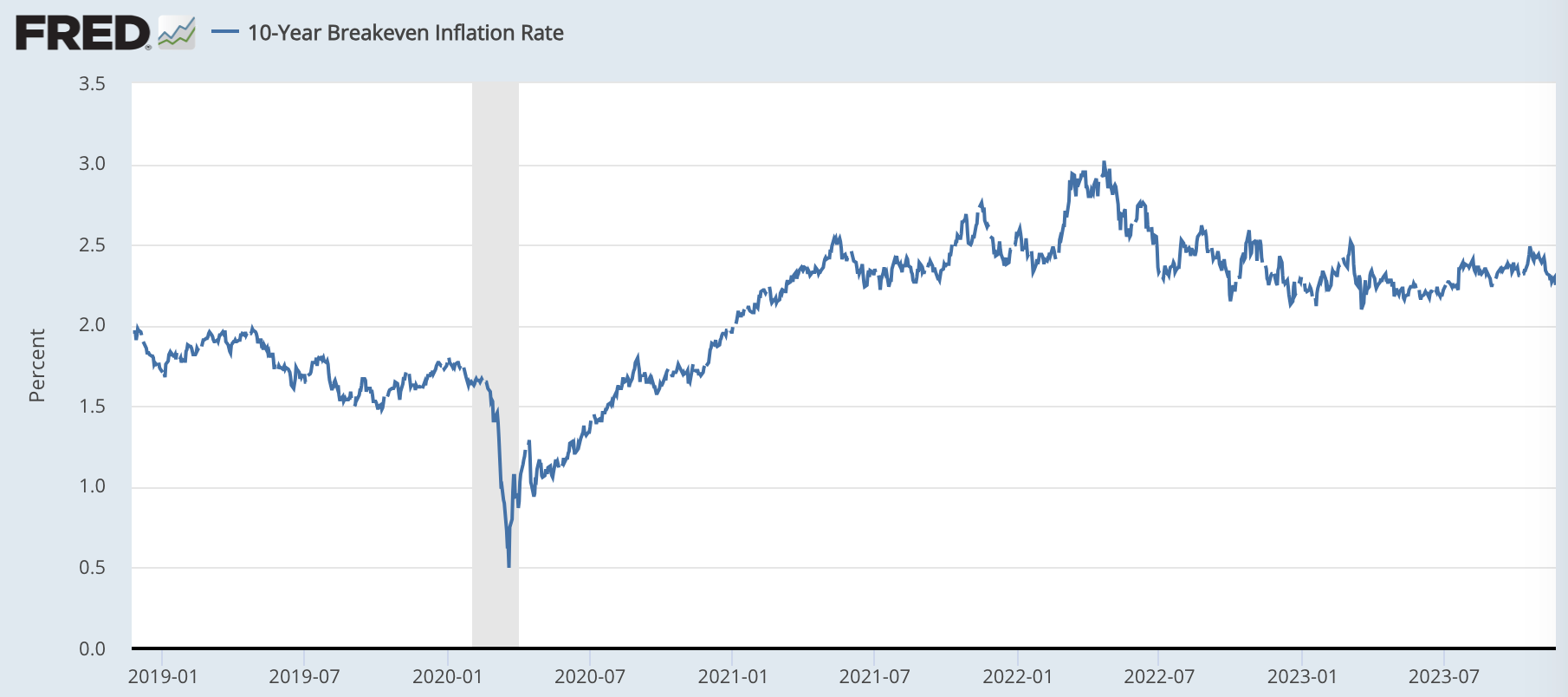 この期待インフレ率の予想は市場よりも大幅に高い。現在、市場の織り込んでいる期待インフレ率は2.2%である。