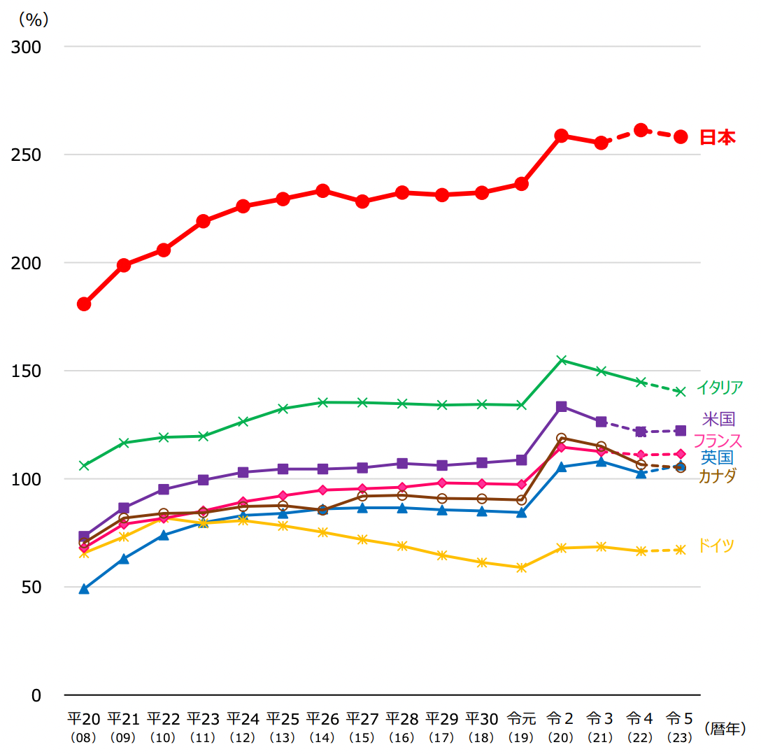 さて、GDPに対する政府債務の比率は、以下のように多くの先進国で100%を超えている。その中でも日本はだんとつであり、その後をイタリアと米国が追っている。
