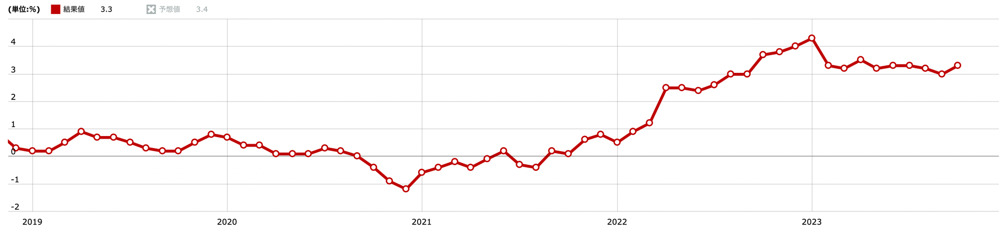 11月24日に発表された日本の消費者物価指数(10月分)は、前年比+3.3%で、前回の+3.0%から0.3ポイントの加速となった。