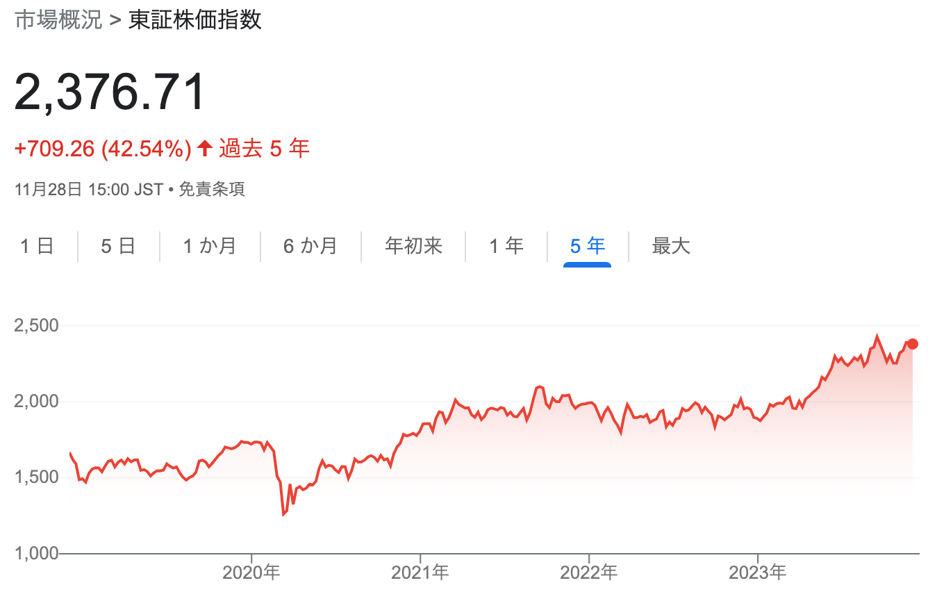 一方、2023年に入って国内のインフレ率が横ばい〜下げ基調となると、株価は再度上昇を始めた。