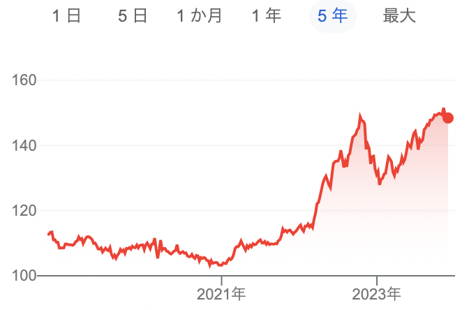 横ばいとはいっても、この間ドル円は110円台〜150円程度まで強烈に円安に振れたので、ドル建てで考えるなら日本株は暴落したといっても差し支えない。